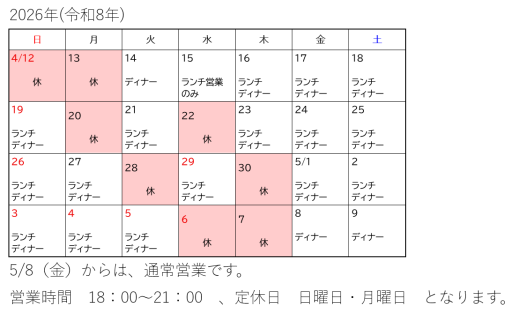 2026年4月15日(水)、4月16日(木)もランチ営業を実施いたします。